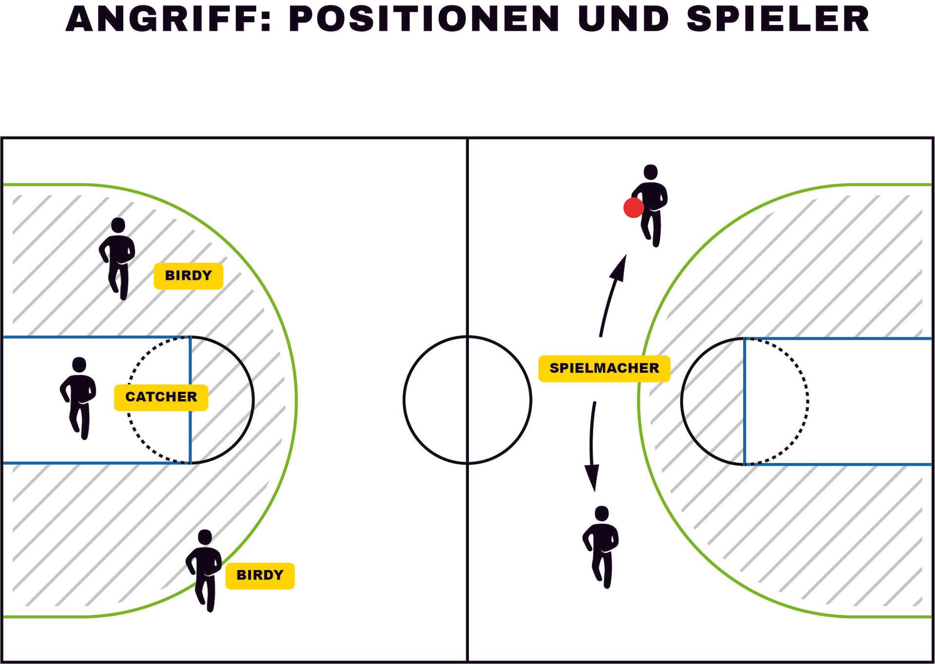 und der Zweipunkte-Linie. Nachdem die Angreifer ihren Ball 3 Mal hintereinander gefangen haben, kann der Ball auch, statt direkt zum Catcher, auch ein Spieler, der in der Birdy Zone
