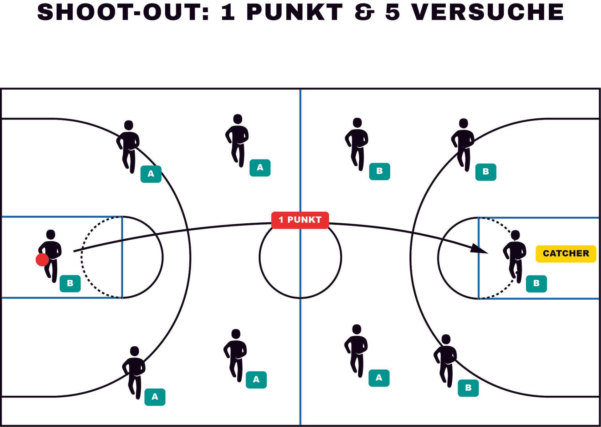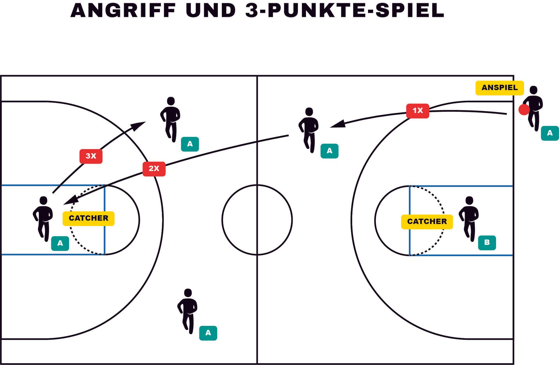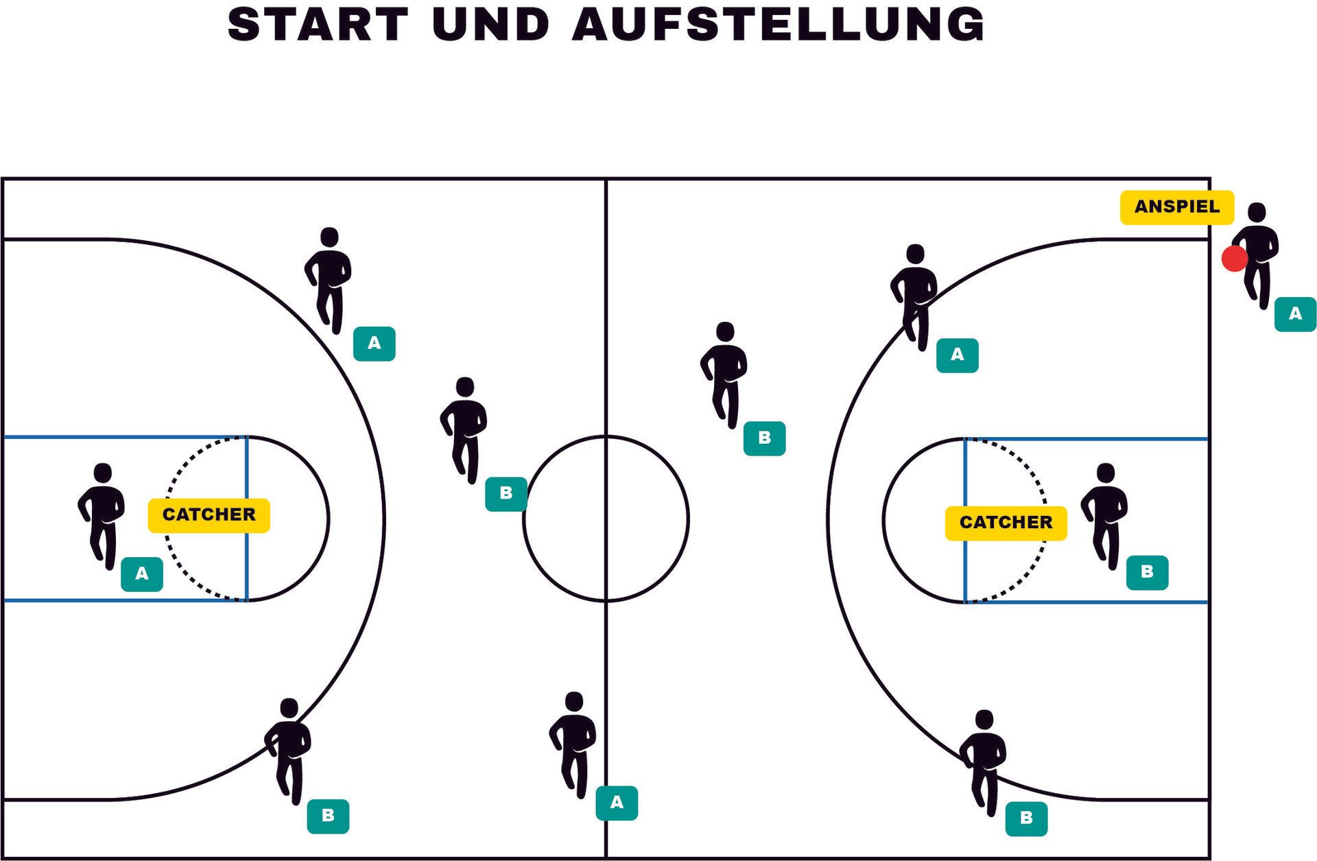 - Direkt zum Catcher werfen und dieser wirft ihn zu einem Spieler hinter der 2-Punkte Linie.