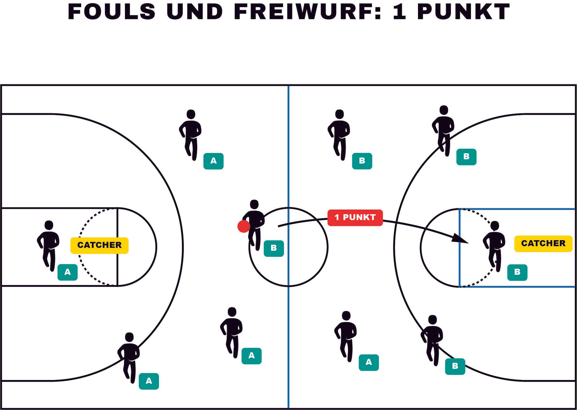 darf werfen (wenn er dazu noch im Stande ist). Die Gegner stehen dabei nicht dazwischen. Bei starken Fouls wird die Spielzeit gestoppt