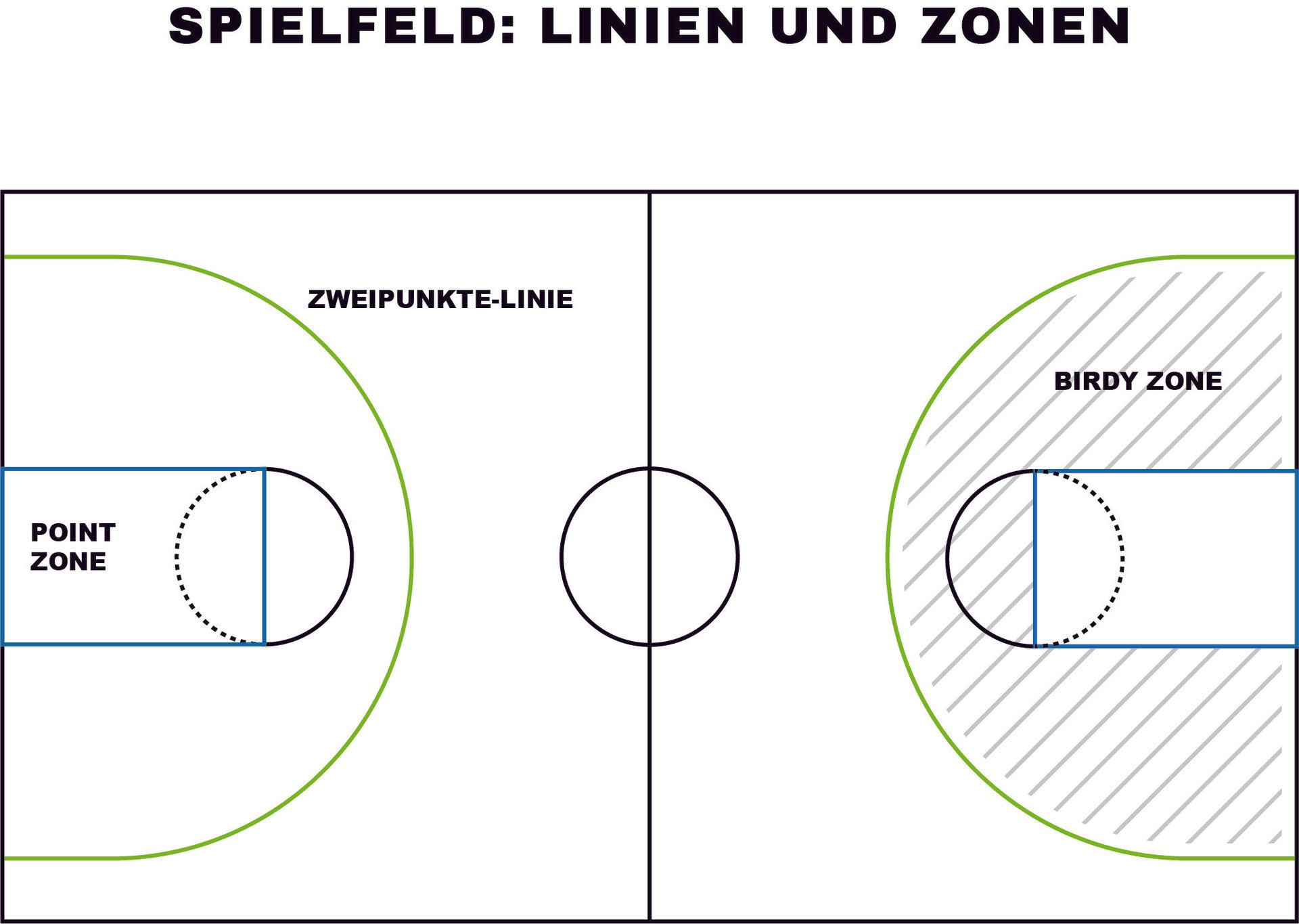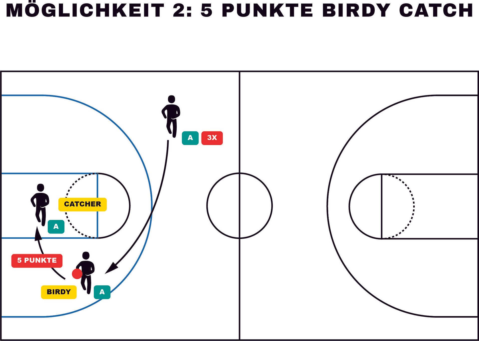 gefangen hat und hinter der 2-Punkte Linie steht, kann den Ball auch zu einem Spieler in der Birdy Zone