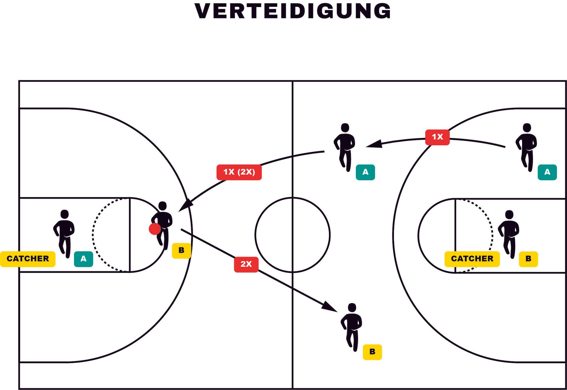 - Direkt zum Catcher werfen und dieser wirft ihn zu einem Spieler hinter der 2-Punkte Linie.